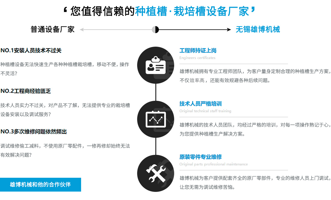您在選擇雄博產(chǎn)品的同時(shí),也選擇無(wú)微不至的終身服務(wù)。可根據(jù)不同客戶實(shí)際需求進(jìn)行種植槽設(shè)備,栽培槽設(shè)備等的特殊工藝設(shè)計(jì)制造專(zhuān)業(yè)一對(duì)一售前/售后/技術(shù)咨詢(xún)指導(dǎo),享受更貼心/放心的設(shè)備使用體驗(yàn)。